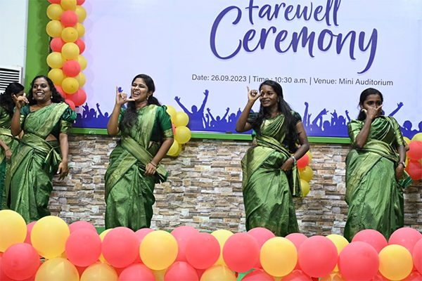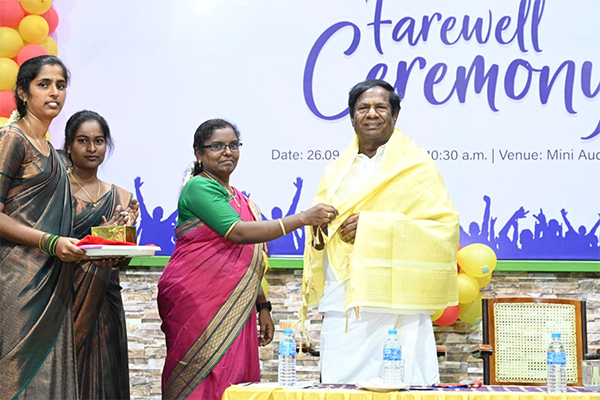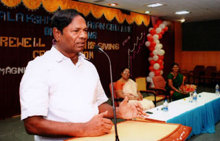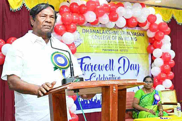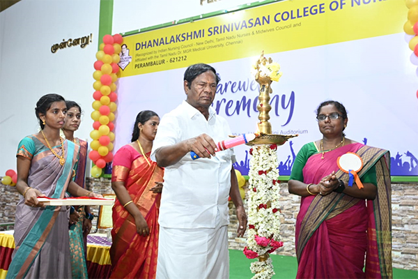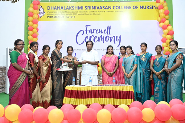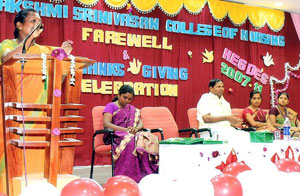The farewell day for “Hegde’s” II batch B.Sc (N) students was celebrated on 19-9-2011 Monday at 4.30pm. Shri.A.Srinivasan Founder, Chairman, Dhanalakshmi Sirnivasan Group of Institution, Perambalur presided over the function. The programme commenced with a prayer song and the kuthuvilakku was lighted by the dignitaries. Mrs. K.Punithalakshmi,M.Sc(N), Principal, Dhanalakshmi Srinivasan College of Nursing, welcomed the gathering.