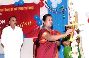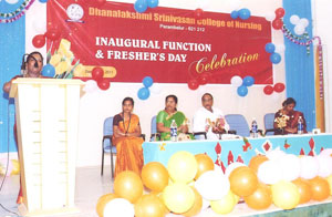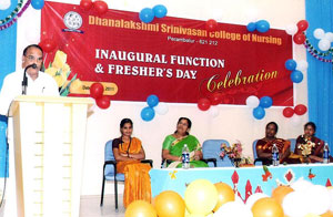 Inauguration of M.Sc (N) & Post Basic B.Sc (N) and Fresher’s Day for theVI batch of B.Sc (N) were celebrated on 10-11-2011 at 11.00am. Ln. M.Rajaram, Former Union Chairman was the chief guest. Shri.A.Srinivasan, Founder, Chairman Dhanalakshmi Srinivasan Group of Institution, Perambalur presided over the function. The programme commenced with the prayer song and kuthuvilakku was lighted by the dignitaries. Mrs. K.Punithalakshmi,M.Sc(N), Principal, Dhanalaskhmi Srinivasan College of Nursing welcomed the gathering.