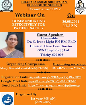 Communication, and teamwork in particular, are pillars of patient safety culture. More frequent communication contact between leaders and members of their team is associated with better patient safety culture.. In this regard the Dhanalakshmi Srinivasan College of Nursing has organized a Webinar titled “Communicating Effectively For Patient’s Safety” on 26.08.2021. The webinar started at 11 am through google meet. Nursing students, faculties and staff nurses and Research scholars from nursing fraternity of various colleges has participated in the webinar. Welcome address was given by Mrs.J.Dhanalakshmi, Organizing chairperson & Principal, Dhanalakshmi Srinivasan college of Nursing, Perambalur. Mrs.R.Vanitha, organizing Secretary & HOD, Mental Health Nursing has unfolded theme of the conference. The scientific session was presented by, Dr.C.Irenelight M.Sc(N), Ph.D, Clinical care coordinator, GVN Hospitals, Trichy. The event ended with a feedback session and Vote of thanks was given by Ms.Nageswari, M.Sc Nursing I year.