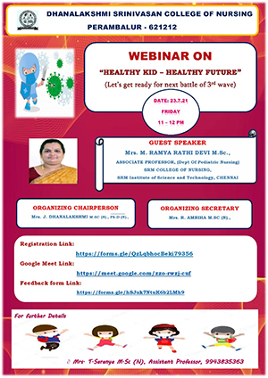 After witnessing a devasting second wave of the covid – 19 pandemic, India is now preparing to face a third wave of the virus. Experts have already predicted that covid – 19 third wave is imminent and they have wanted children would be affected by the third wave most. School closure, social distancing and confinement increase the risk of poor nutrition among children. Furthermore the pandemic has the potential to create new vulnerable children and countries must prepare to respond to growing needs for support. With warnings from experts, and a second wave that has served as a lesson on how prepared the country is, states are already taking steps to ensure there are arrangements in place to protect children. The main aim of this webinar is that to learn about prevention of children from Covid – 19 third wave. UG & PG students, staff Nurses from Government and Private Institutions, Principals, Professors, Associate professors, Assistant professors and Nursing Tutors from various colleges have attended the webinar through google meet. 174 candidates were registered. Guest speaker Mrs. M.Ramya Rathi Devi M.sc (N), Ph.D, Professor cum HOD of Child Health Nursing invited from SRM College of Nursing, Chennai. She presented the topic very effectively and the participants gained more knowledge about Epidemiology, Risk factor, Clinical manifestation, Diagnosis, Management, Role of Pediatric Nurse and Prevention of Covid – 19. The Session started sharply by 11 am with welcome address by Ms.R.Ambiha, Organizing Secretary, and then opening of the theme was done byMrs. J.Dhanalakshmi, Organizing Chairperson, and then the session handed over to Guest speaker. After the speech, feedbacks were discussed between the guest speaker and participants and the session ended with Vote of thanks, by Ms.Sathya, M.Sc Nursing I year student. Whole session was monitored by Ms. T.Saranya, Assistant Professor of Dhanalakshmi Srinivasan College of Nursing. 84 candidates were expressed their feedback as the webinar was excellent and they gained more knowledge regarding Prevention and awareness of Covid 19 to Children.