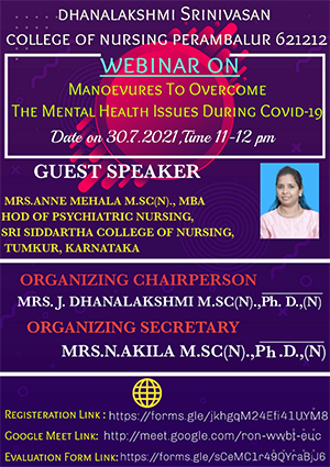 COVID-19 pandemic and lockdown has brought about a sense of fear and anxiety around the globe. This phenomenon has led to short term as well as long term psychosocial and mental health implications for children and adolescents. The quality and magnitude of impact on minors is determined by many vulnerability factors like developmental age, educational status, pre-existing mental health condition, being economically underprivileged or being quarantined due to infection or fear of infection.. Many of us are facing challenges that can be stressful, overwhelming, and cause strong emotions in adults and children. Public health actions, such as social distancing, are necessary to reduce the spread of COVID-19, but they can make us feel isolated and lonely and can increase stress and anxiety.Learning to cope with stress in a healthy way will make you, the people you care about, and those around you become more resilient. In this regard the Mental health Nursing department of Dhanalakshmi Srinivasan College of Nursing has organized a Webinar titled “ Maneuvers To Overcome Mental Health Issues During Covid 19” on 30-07-2021. The webinar started at 11 am through google meet. Nursing students, faculties and staff nurses and Research scholars from nursing fraternity of various colleges has participated in the webinar. Welcome address was given by Mrs.J.Dhanalakshmi, Organizing chairperson & Principal, Dhanalakshmi Srinivasan college of Nursing, Perambalur. Mrs.N.Akila, organizing Secretary & Associate professor has unfolded theme of the conference. The scientific session was presented by, Ms.Anne Mehala M.Sc(N), M.B.A., HOD Mental Health Nursing, Sri Siddhartha College of Nursing Tumkur, Karnataka. The event ended with a feedback session and Vote of thanks was given by Mrs.N.Akila.