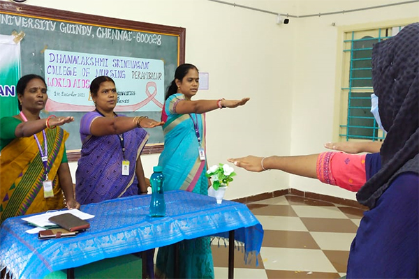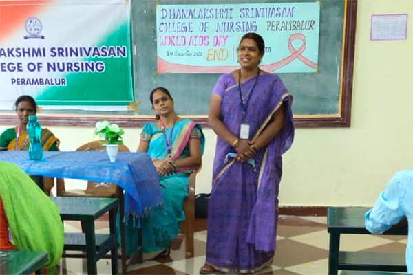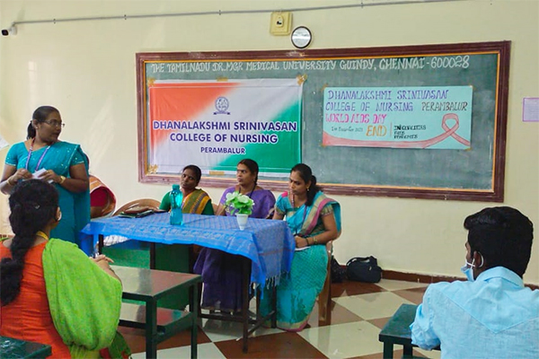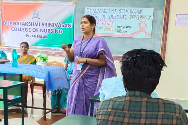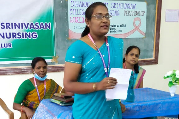 World AIDS day is celebrated on December First of every year. AIDS day celebration mainly focuses on educating the public on HIV/AIDS, to increase support and to unitedly fight against this deadly disease. The theme of World AIDS day celebration of this year is " END INEQUALITIES END AIDS END PANDEMICS" In this regard the Management and Principal of Dhanalakshmi Srinivasan College of Nursing, Perambalur has organised a health awareness talk on HIV/AIDS. Mrs.Aanandhi, Associate Professor cum HOD, Community health nursing welcomed the gathering. Mrs.Padmavathi, ICTC counsellor, Ammapalyam has consented to be the chief guest and delivered health talk on HIV/AIDS. Mrs.Muniyammal, HOD OBG Nursing has delivered the AIDS day pledge, followed by pamphlet distribution. Mrs.J.Sathyapriya, Associate Professor, Community health nursing has delivered the vote of thanks.